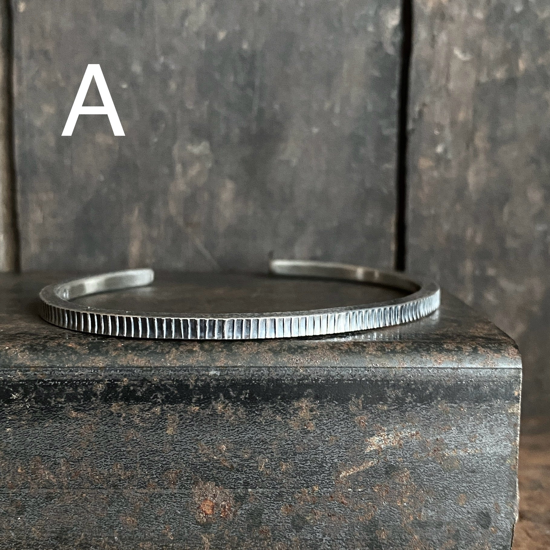 Hand forged from ample square stock, these cuff bracelets have stamped patterns for added interest.