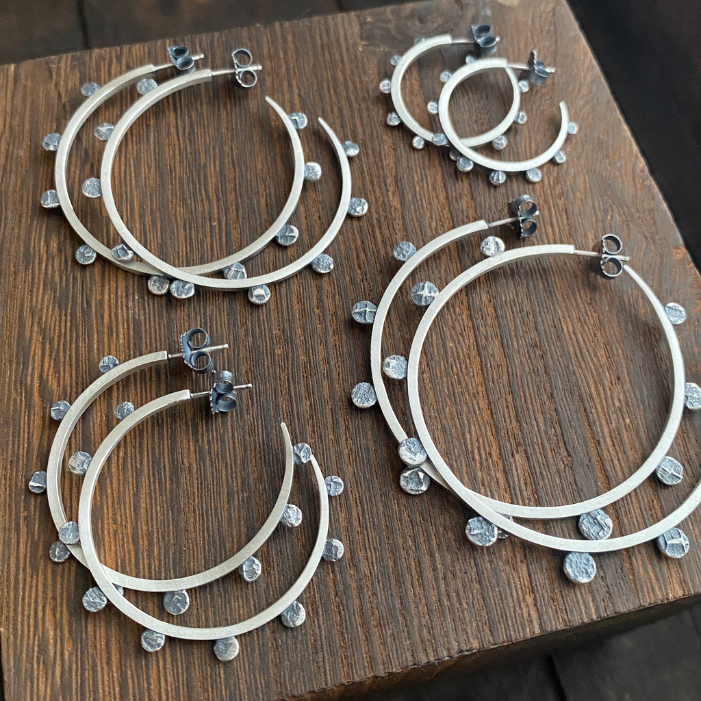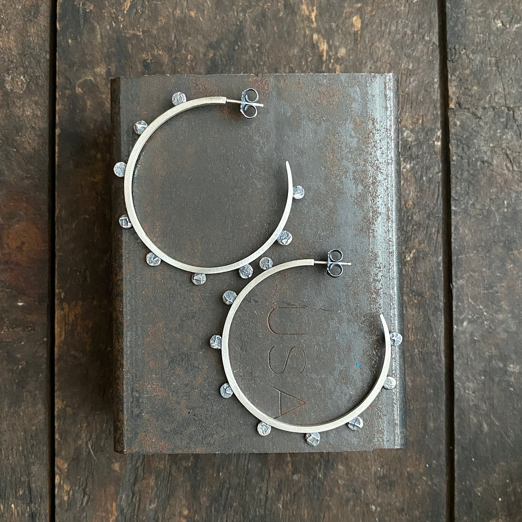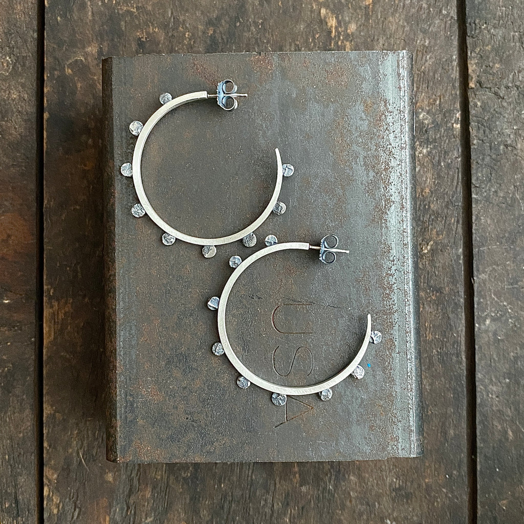 Sterling silver hoop earrings are accented with nine textured dots around the outer perimeter. Posts and ear nuts are sterling silver as well.