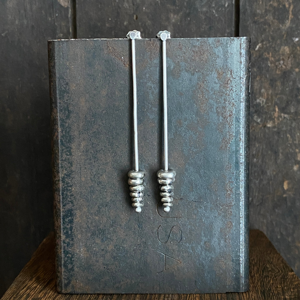 Handmade sterling silver beads are threaded onto long sterling silver stems to create an elegant profile. Ear post and nuts are sterling silver as well.