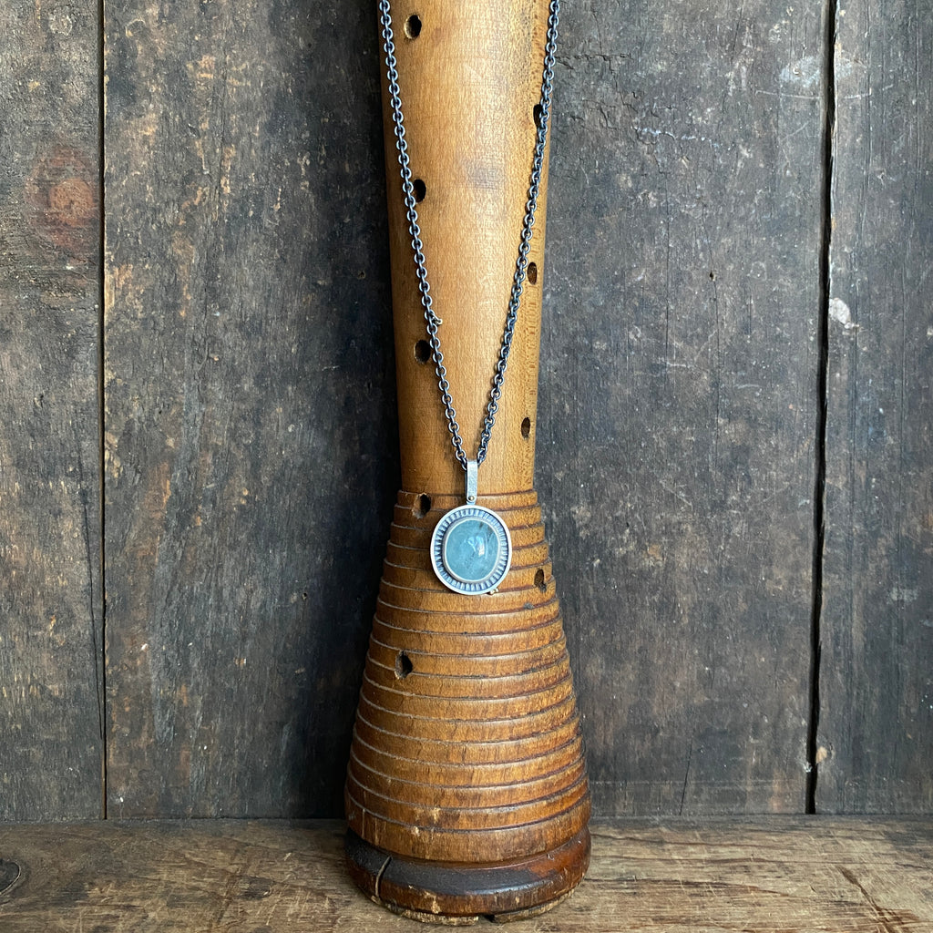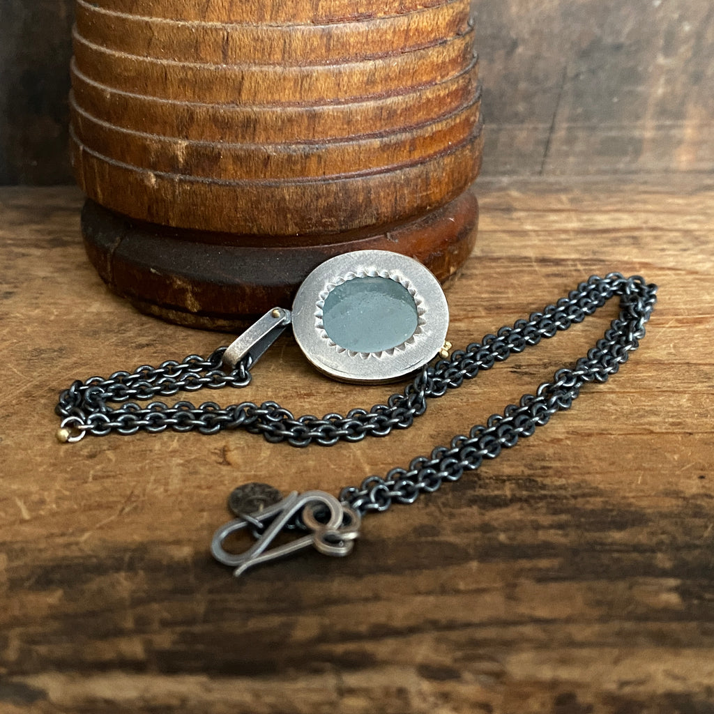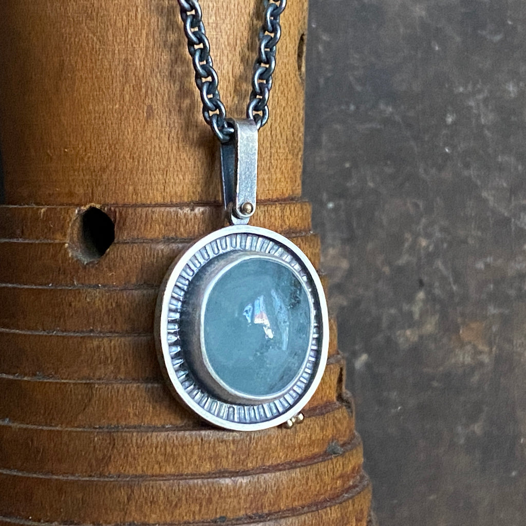 An aquamarine cabochon set in a sterling silver chiseled framed bezel is accented with two tiny 18k yellow gold dots. The hinged bail attaches to the pendant with an 18k yellow gold pin rivet. The pendant hangs from an oxidized sterling silver cable chain accented with a tiny 18k gold bead charm.