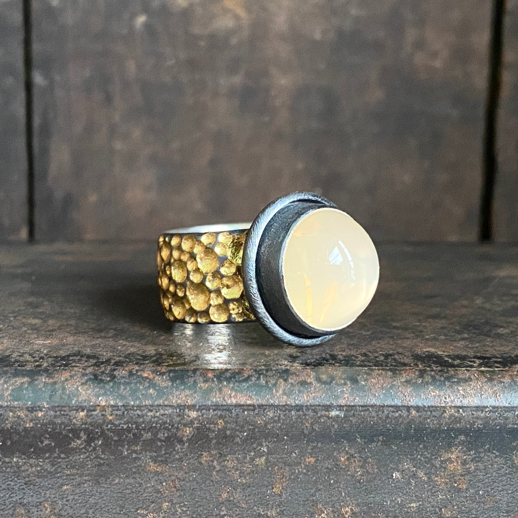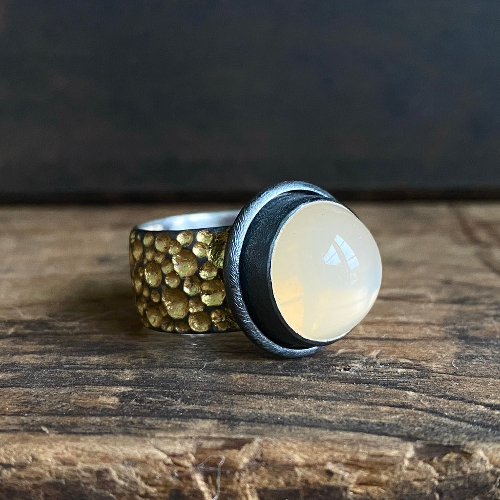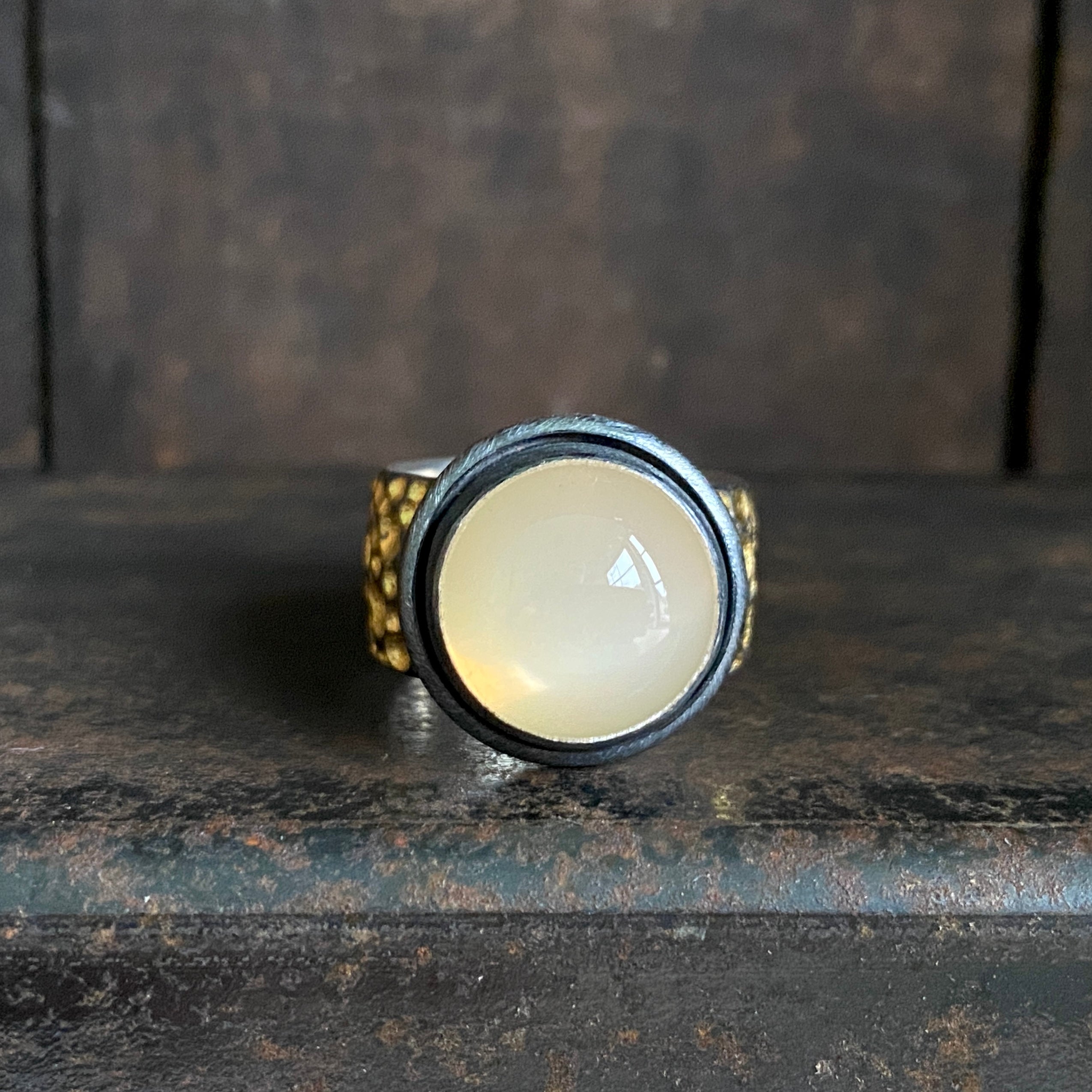 Hand constructed ring in sterling silver features a golden moonstone cabochon atop a 23.5k gilded meteorite textured shank. The band measures 10mm in width.