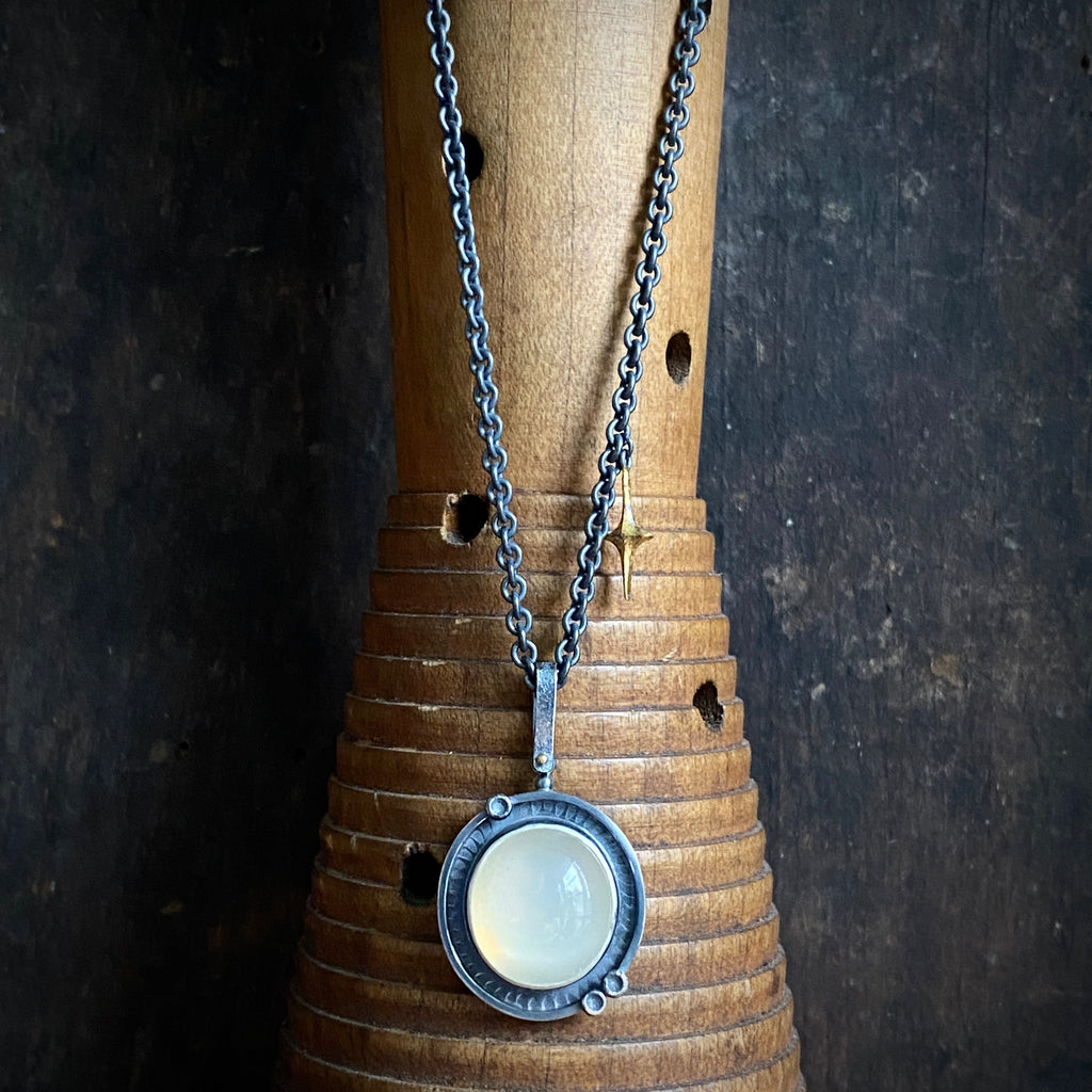 A golden moonstone cabochon set in a sterling silver frame accented with a chiseled pattern and a few cratered dots hangs from an oxidized sterling silver cable chain accented with a tiny 23.5k gilded four point star.