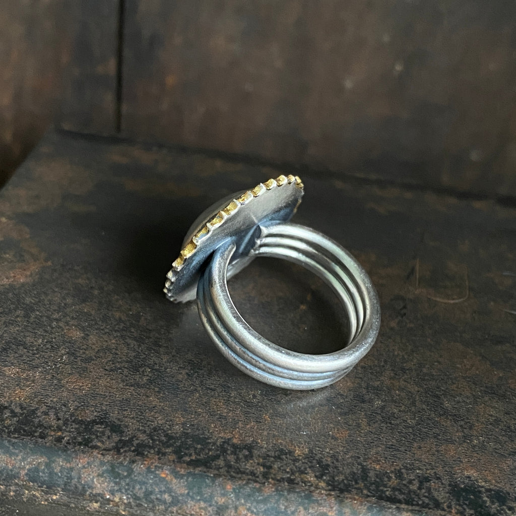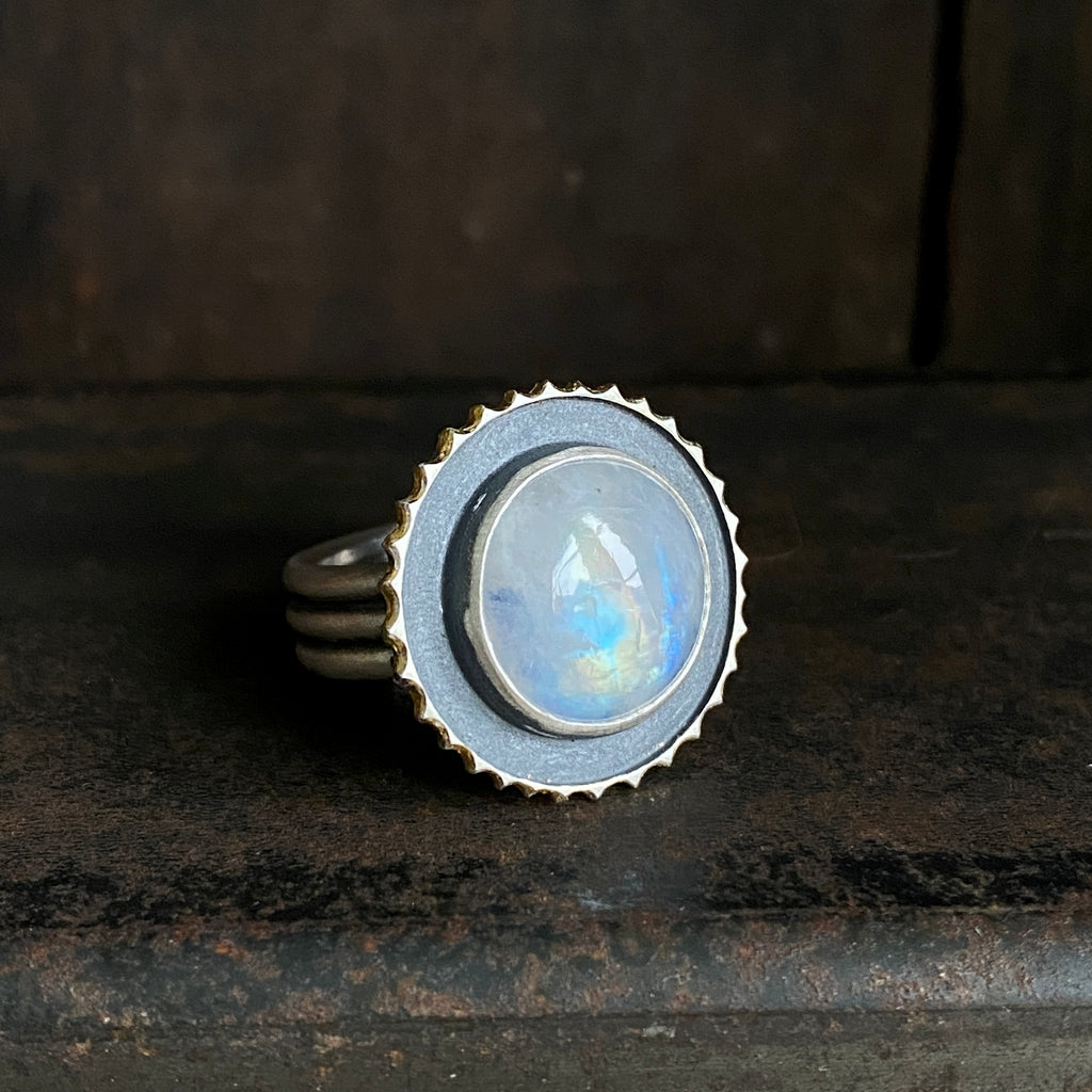 Hand constructed ring in sterling silver features a framed rainbow moonstone cabochon. The outer edge of the scalloped frame has a bit of 23.5k gilding. The shank measures 6 mm in width.