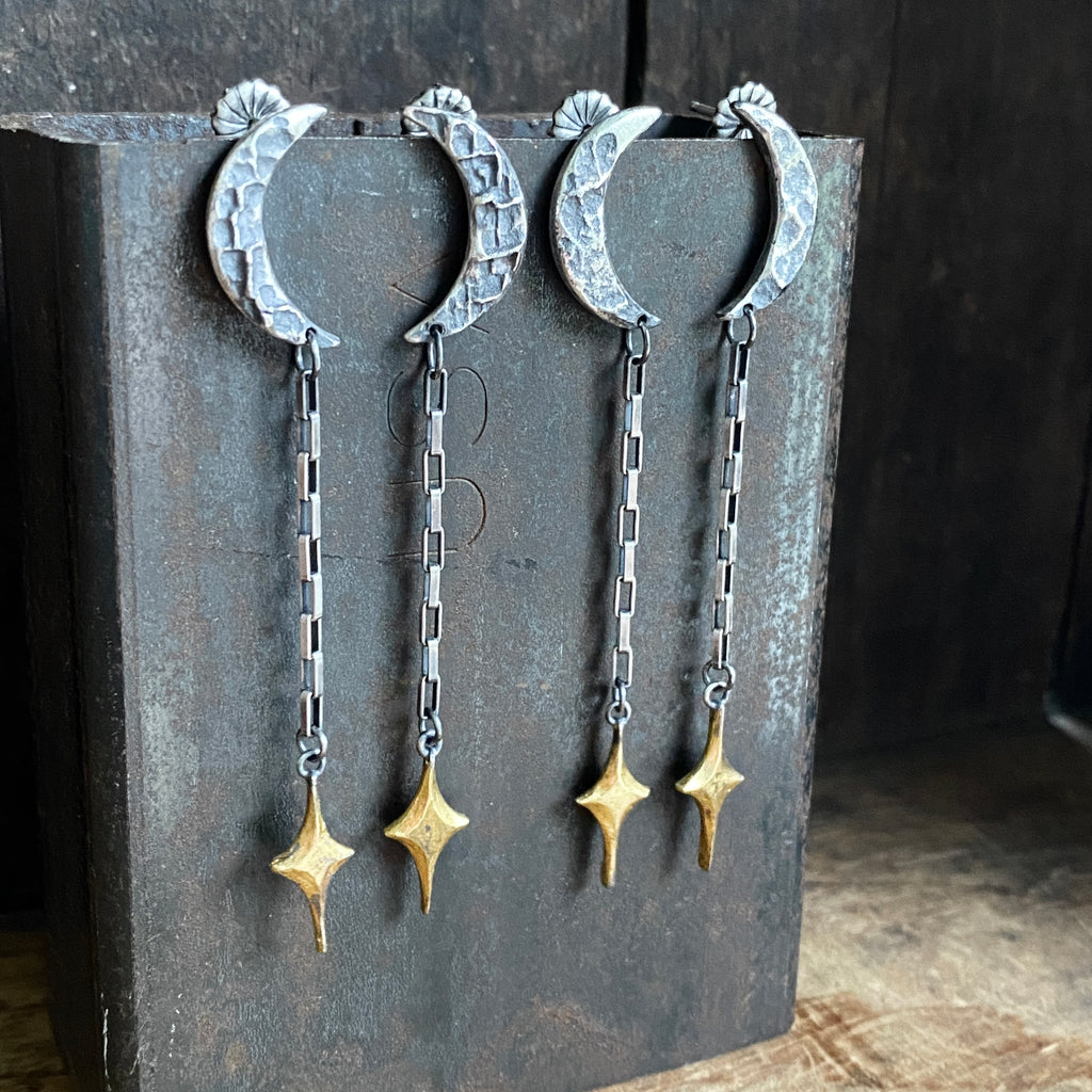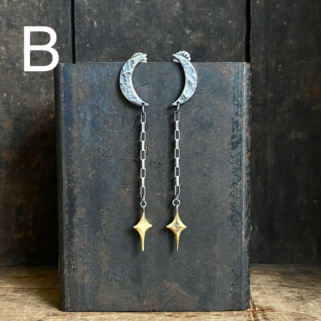 Long and elegant.  23.5k gilded sterling star hang from box chains that attach to sterling silver crescent moon studs.