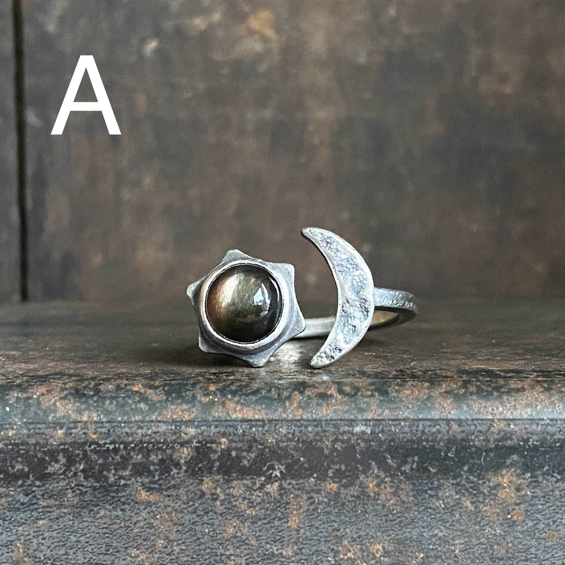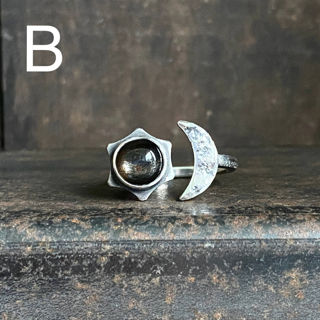 Sterling silver split ring featuring an 8mm black moonstone cabochon and a textured crescent moon.