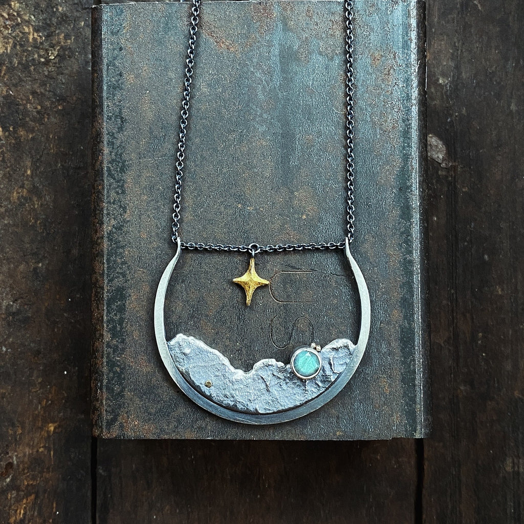 The pendant hangs from an oxidized sterling silver cable chain which also has a 23.5k gilded four point star. The clasp is a simple hook and eye catch.