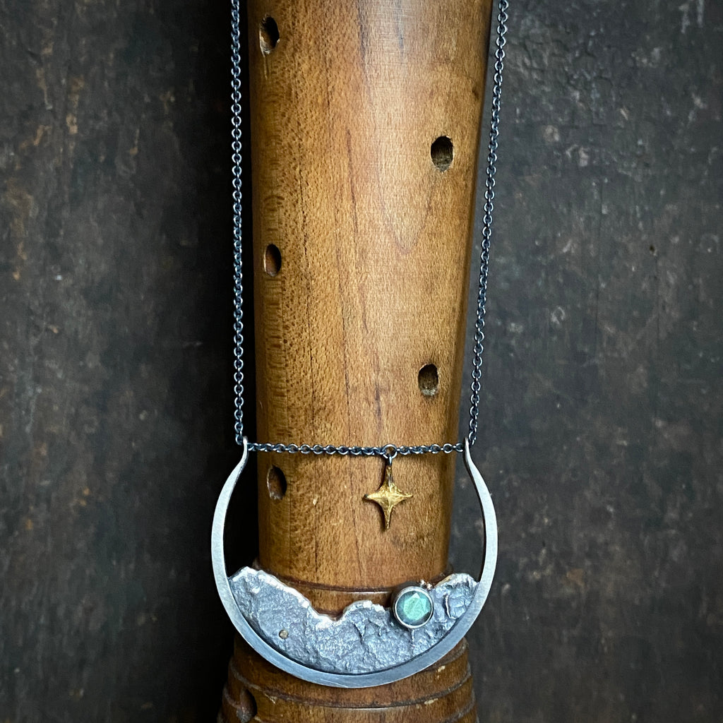 A hand formed sterling silver open top circle frames a slice of my signature lunar textured sterling silver, a few tiny 18k gold dots, and a tube set faceted 6mm labradorite.