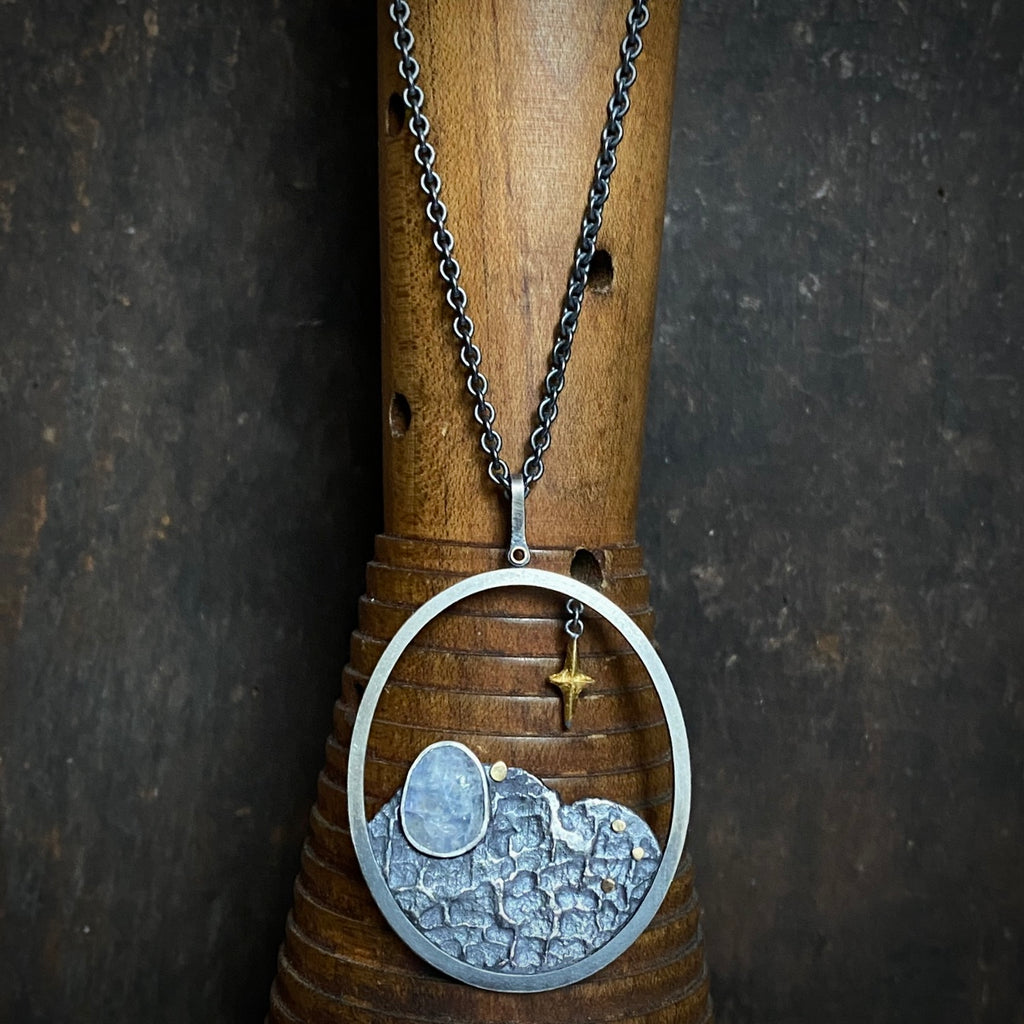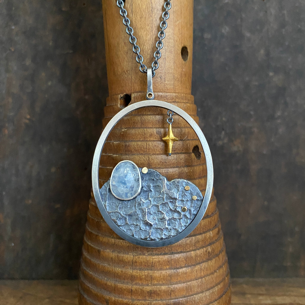 A hand formed sterling silver oval frames a slab of my signature lunar textured sterling silver, four 18k gold dots, and a bezel set rose cut rainbow moonstone cabochon. A 23.5k gilded sterling silver four point star hangs from the oval just off-center.
