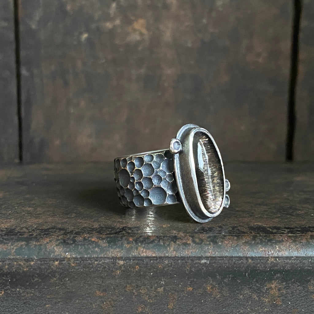 Hand constructed ring in sterling silver features a lattice black moonstone atop a meteorite textured 10mm wide band.