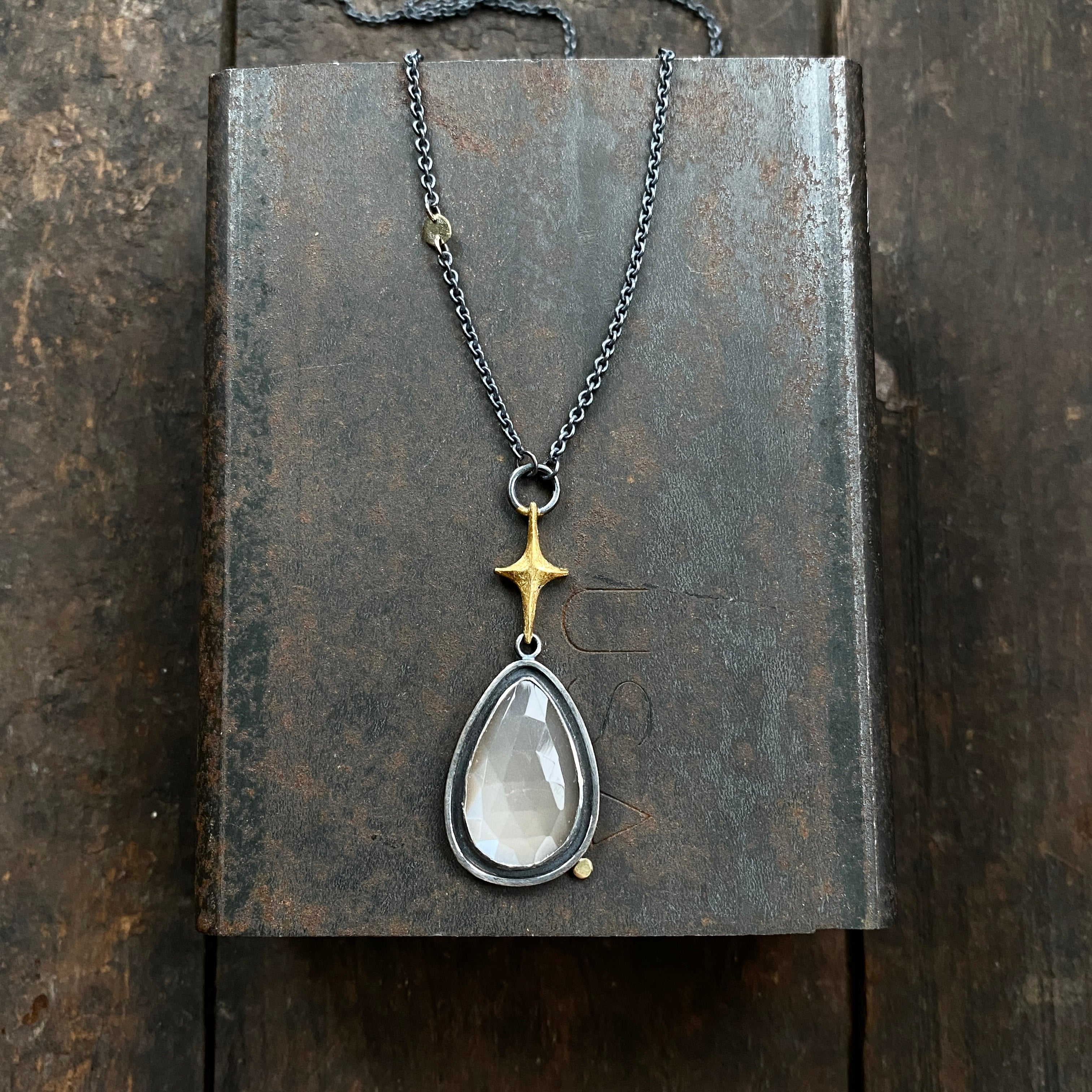 A teardrop shaped, rose, cut warm, gray moonstone set in Sterling silver hangs from a four point sterling star gilded with 23.5k gold.