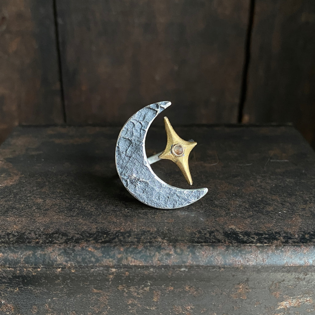 Hand constructed split ring in sterling silver features a textured crescent moon and a 23.5k gilded star with a 3.1mm rose cut diamond center accent.