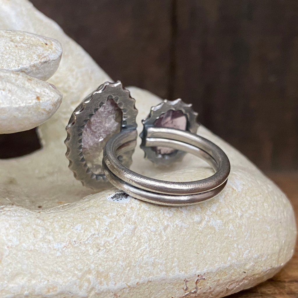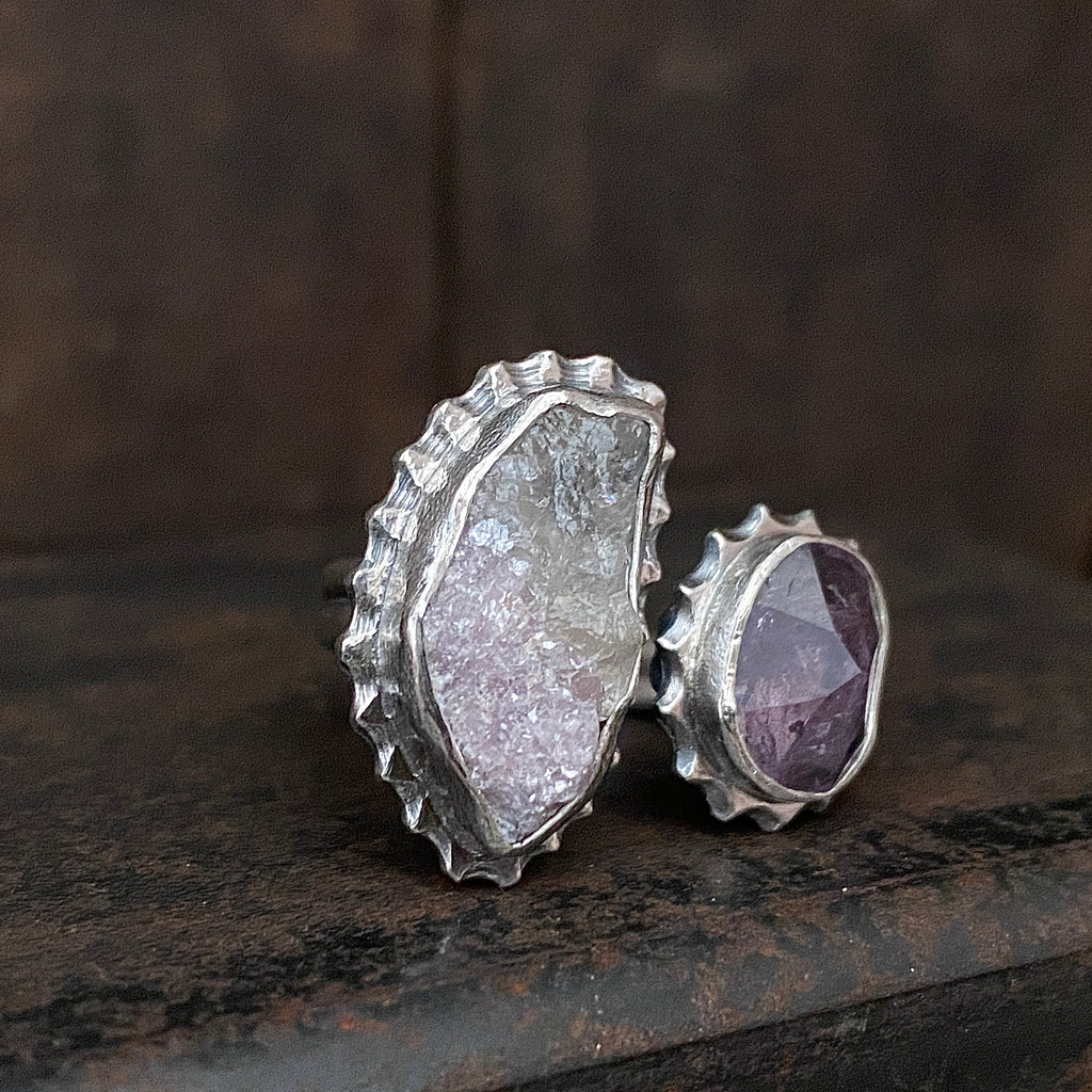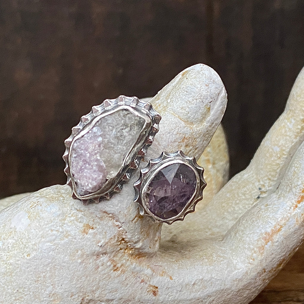 Hand constructed ring in sterling silver features a rose cut lavender tourmaline and a raw specimen of lepidolite in quartz from my state of Maine.