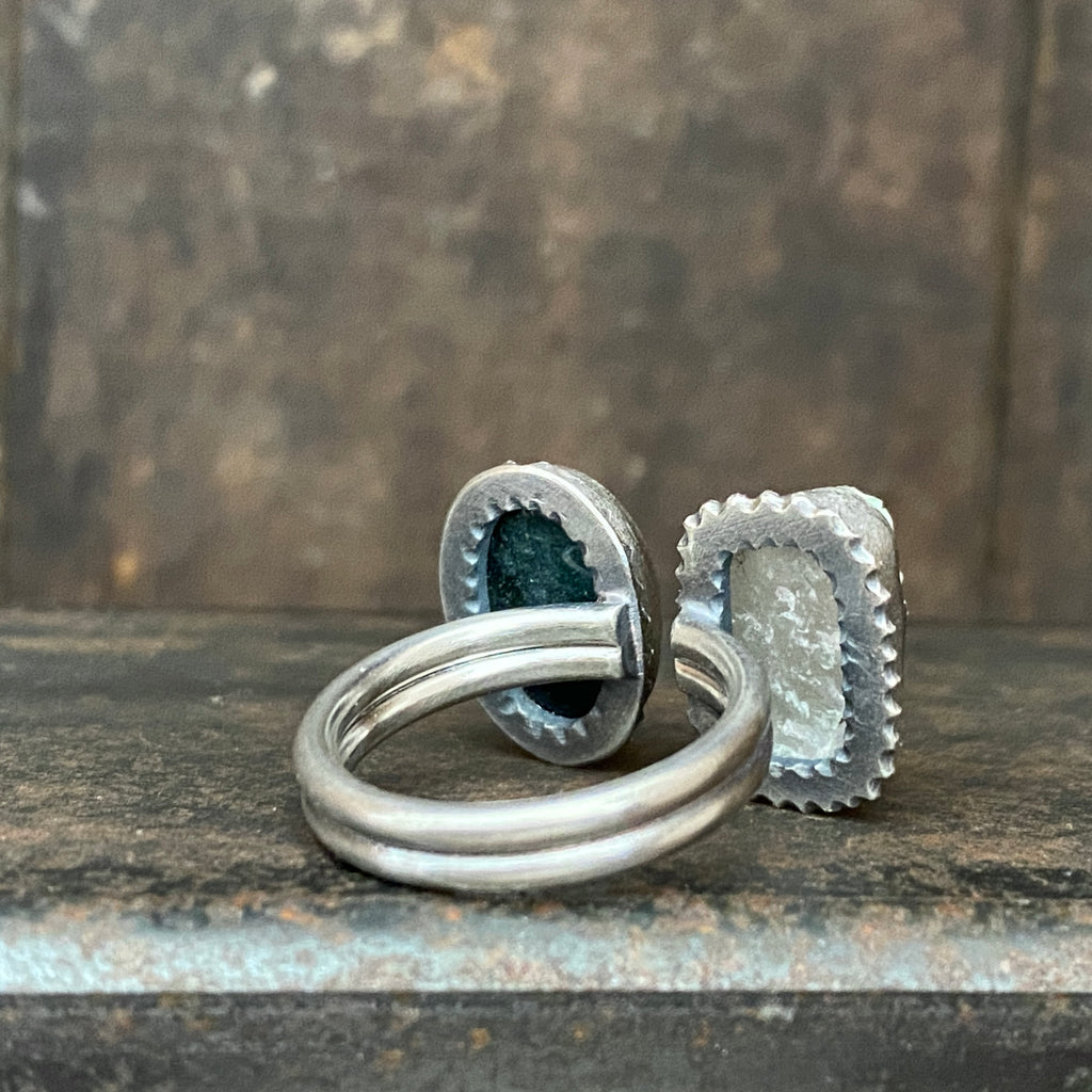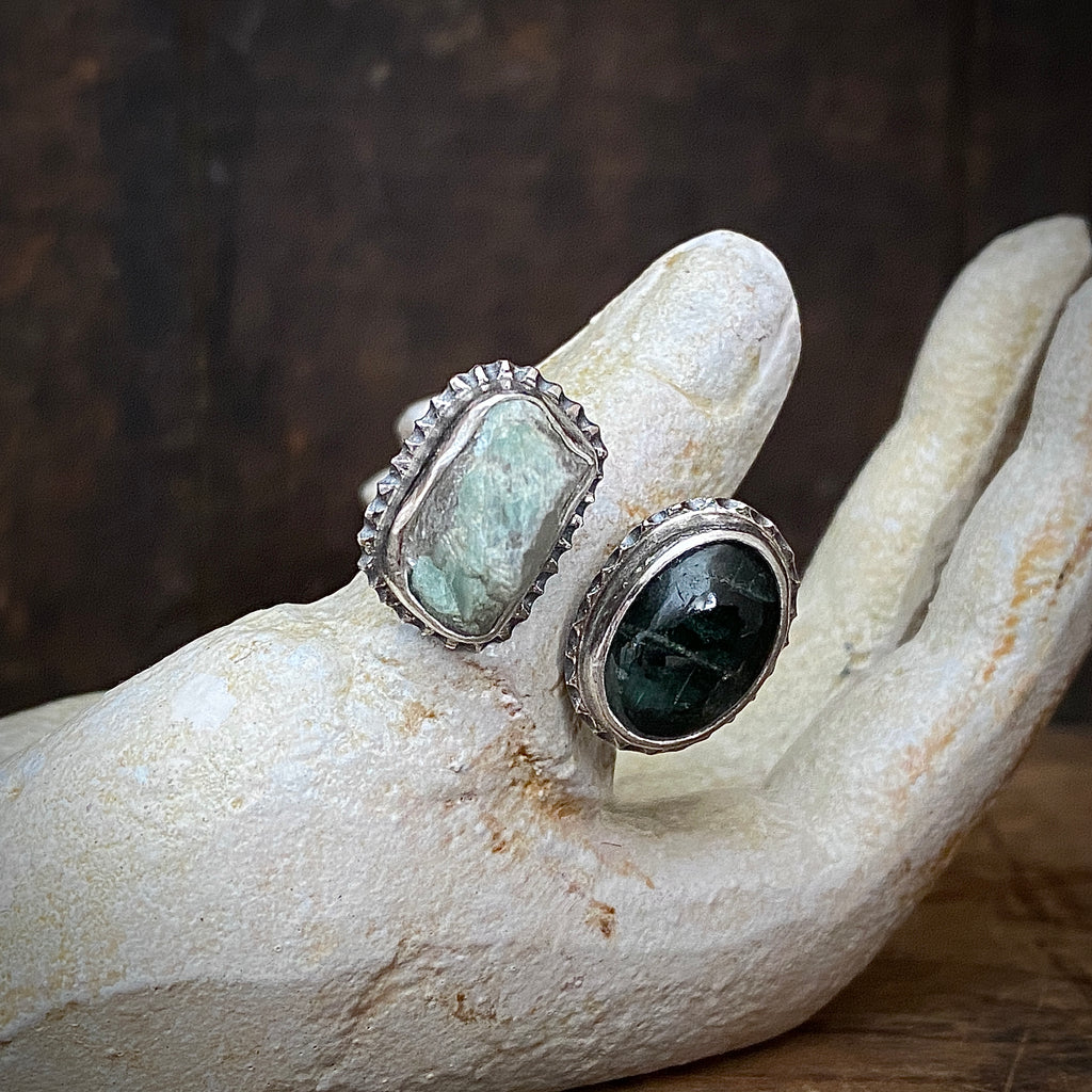 Hand constructed ring in sterling silver features a natural cat’s eye deep teal tourmaline cabochon and a raw specimen of pale green tourmaline in quartz from my state of Maine.