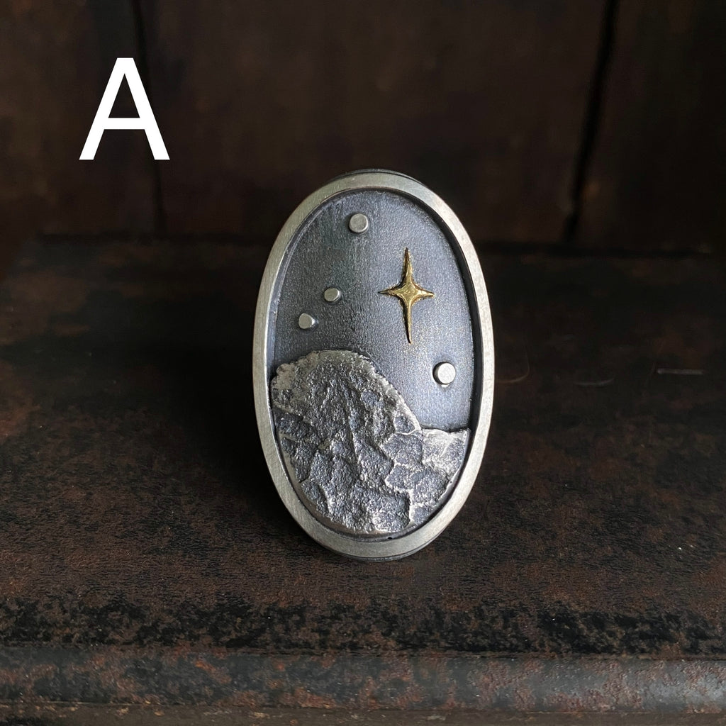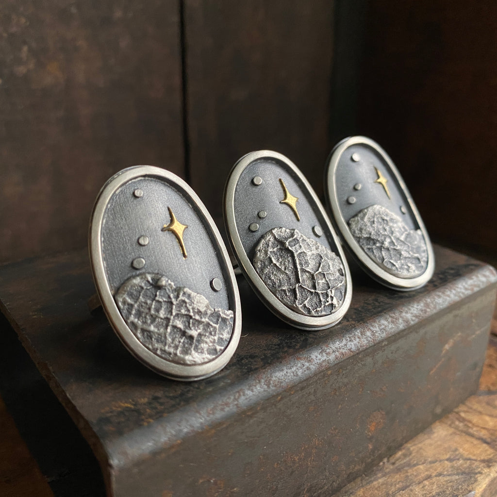 Hand constructed ring in sterling silver emulates an evening sky with a texture landscape and and a 23.5k Keum boo gilded star.