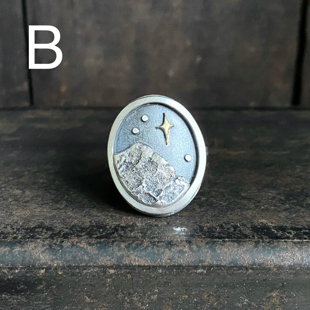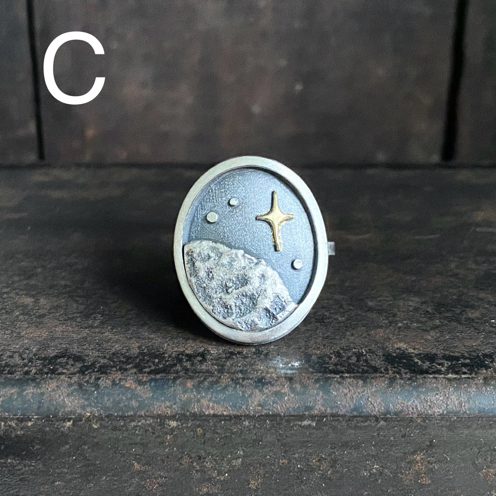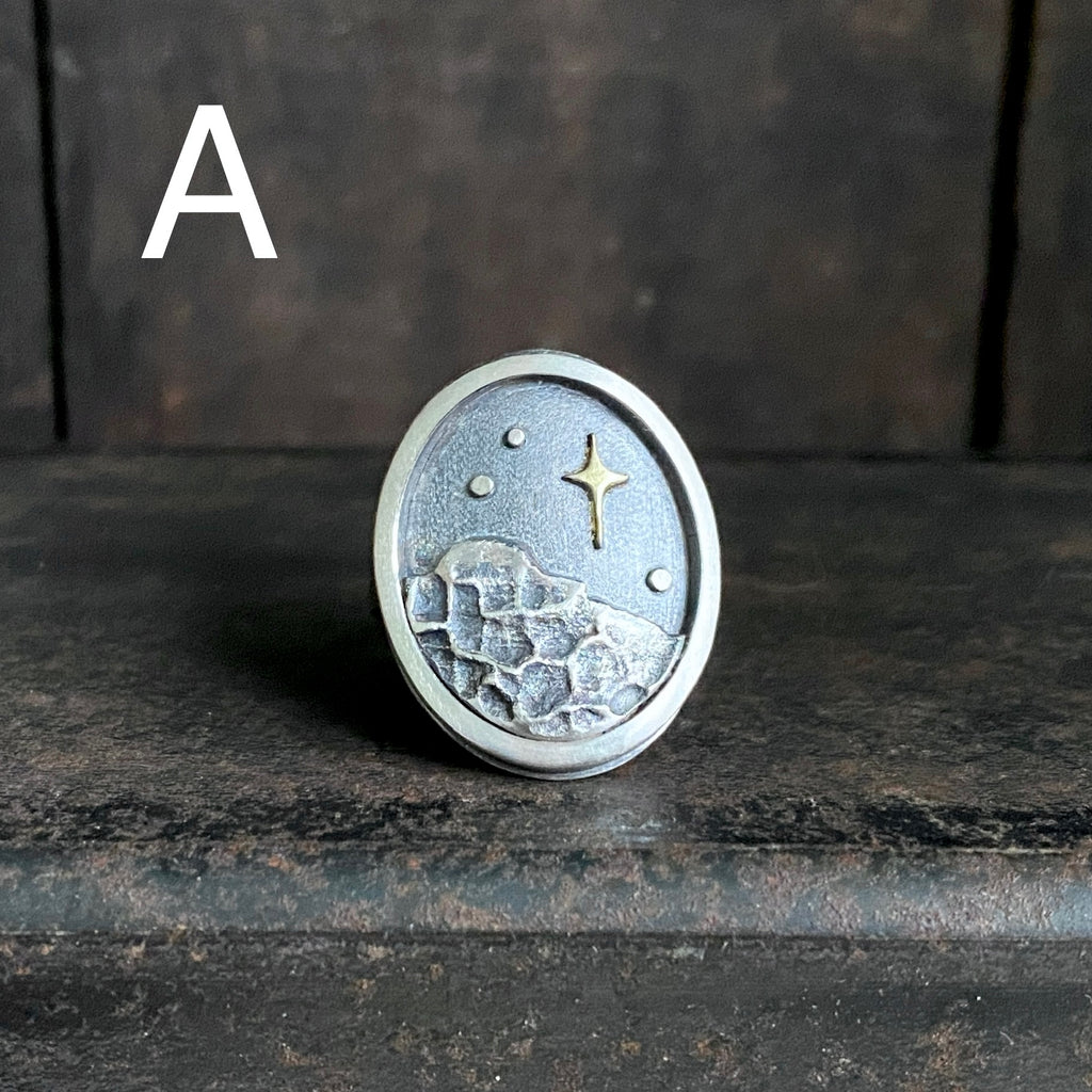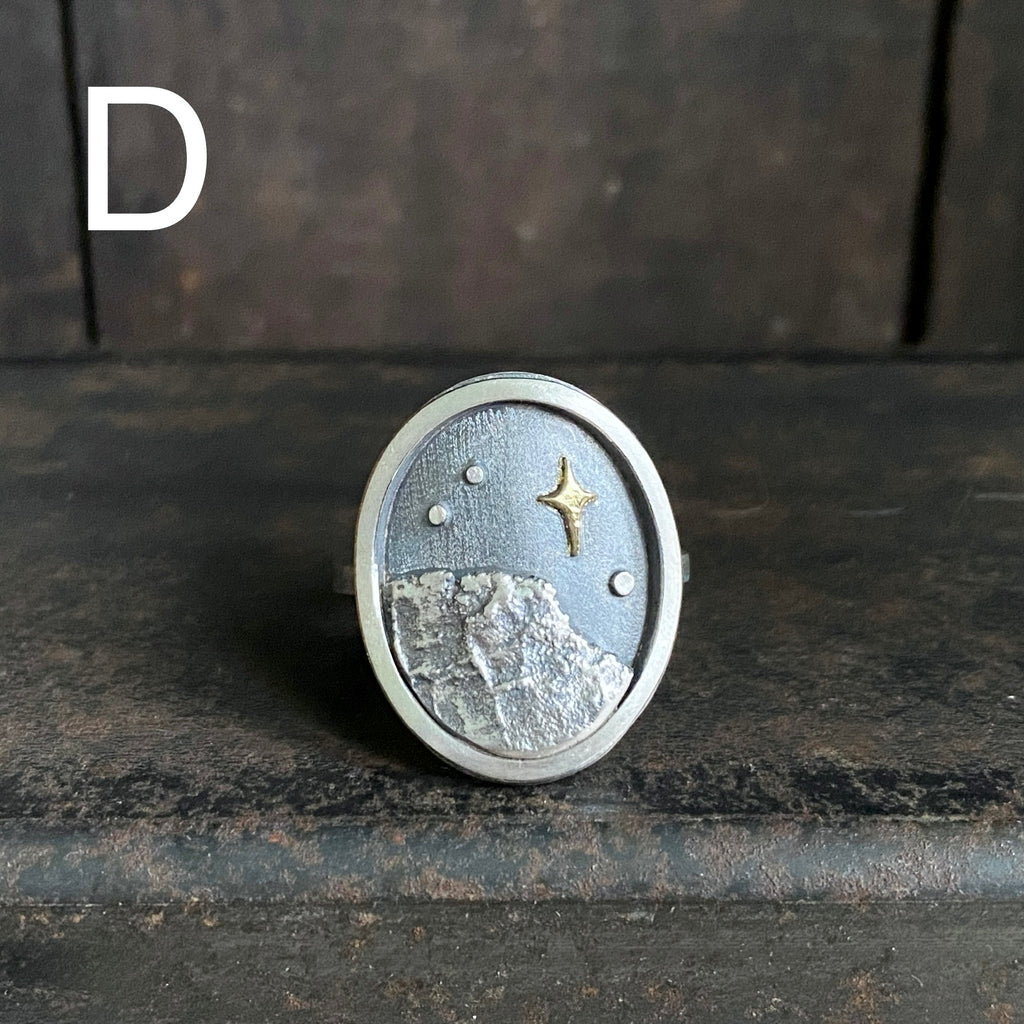 Hand constructed ring in sterling silver emulates an evening sky with a texture landscape and and a 23.5k Keum boo gilded star.