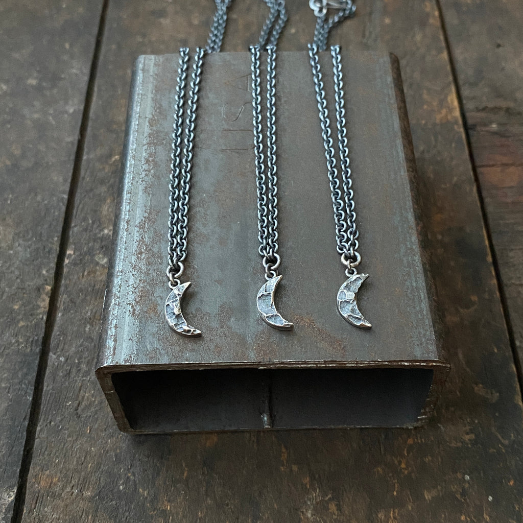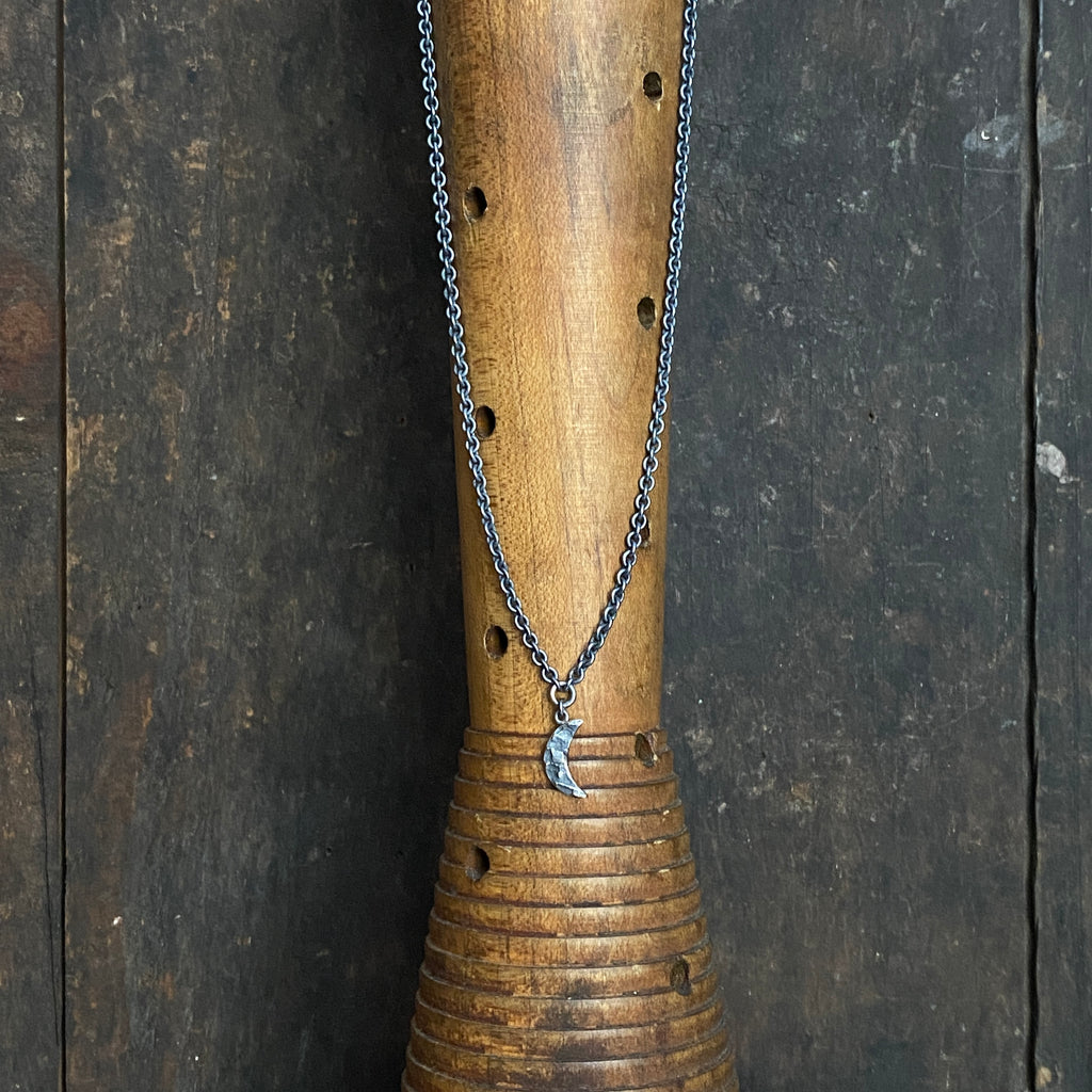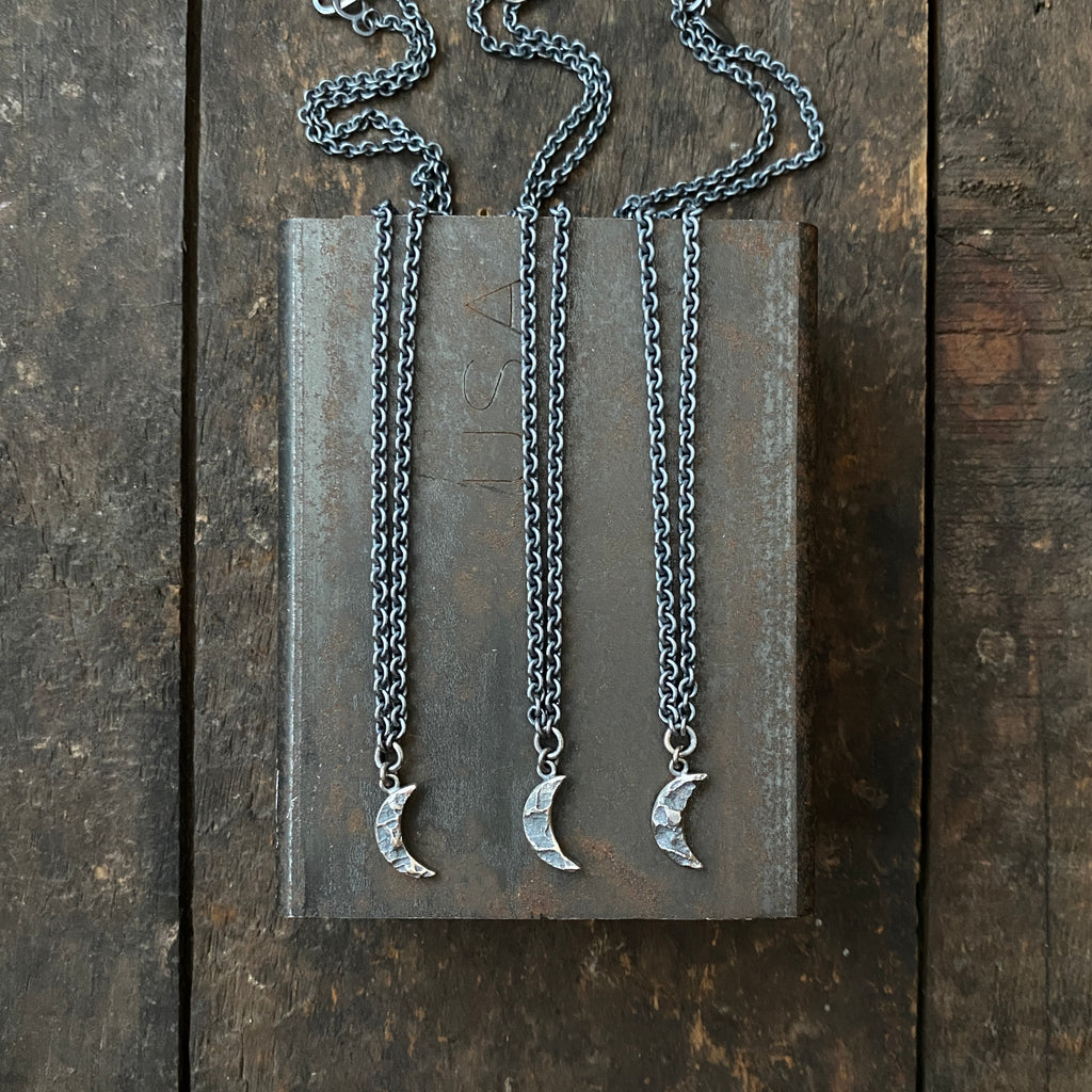 A sterling silver crescent moon pendant hangs from an oxidized sterling silver cable chain. Each moon is individually created so please expect slight variations in texture.