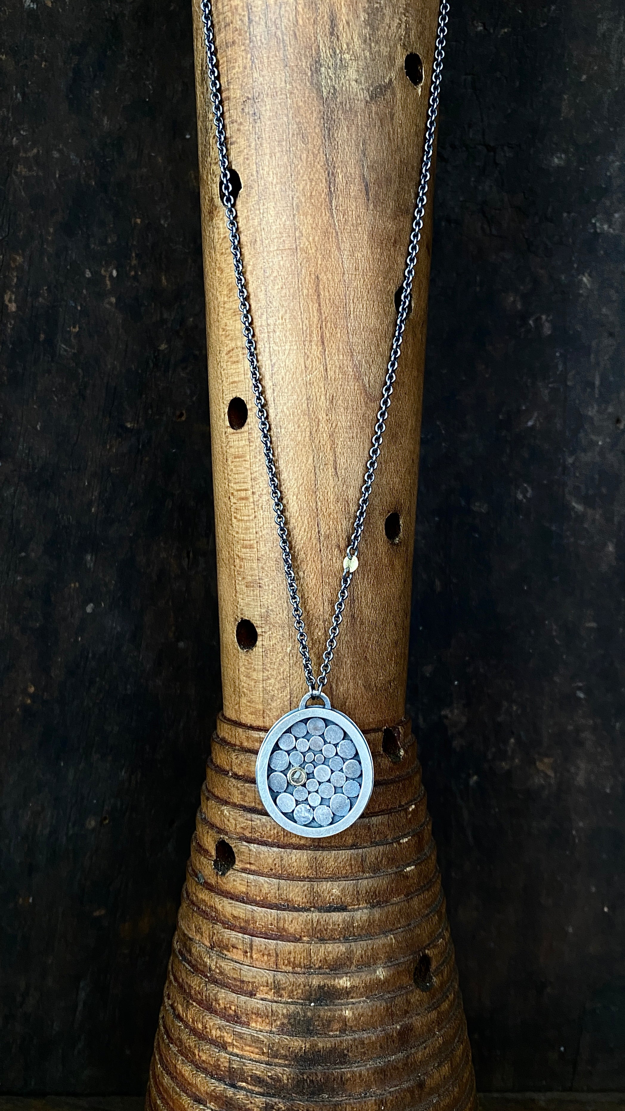 A hand constructed pendant with individually soldered, sterling silver dots and an 18k gold bezel set rose, cut diamond which measures 2.5 mm in diameter.